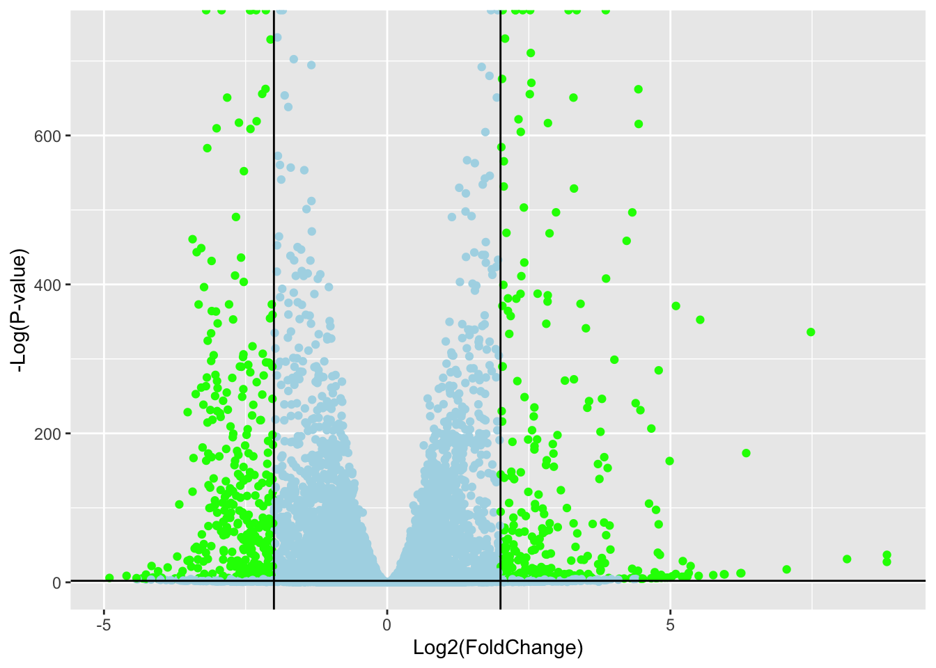 mycols[ abs(res$log2FoldChange) > 2 ] <- "green"