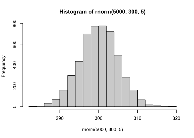 hist(rnorm(5000, 300, 5))