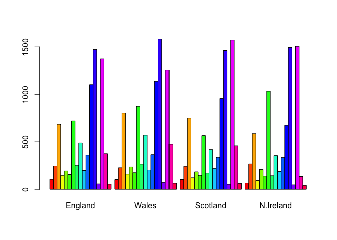 barplot(as.matrix(x), beside=T, col=rainbow(nrow(x)))