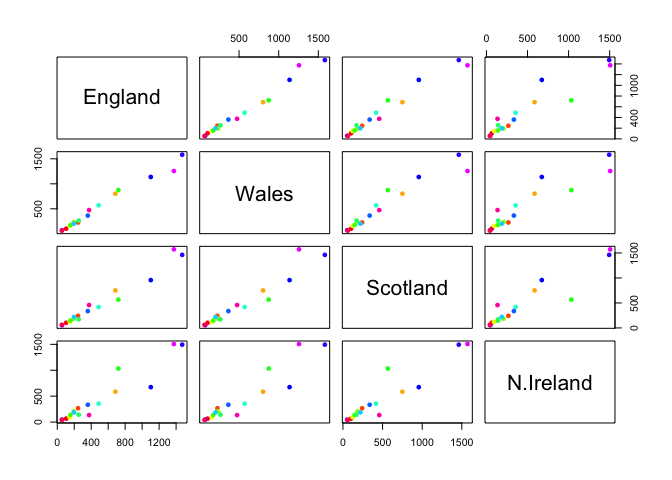 pairs(x, col=rainbow(nrow(x)), pch=16)