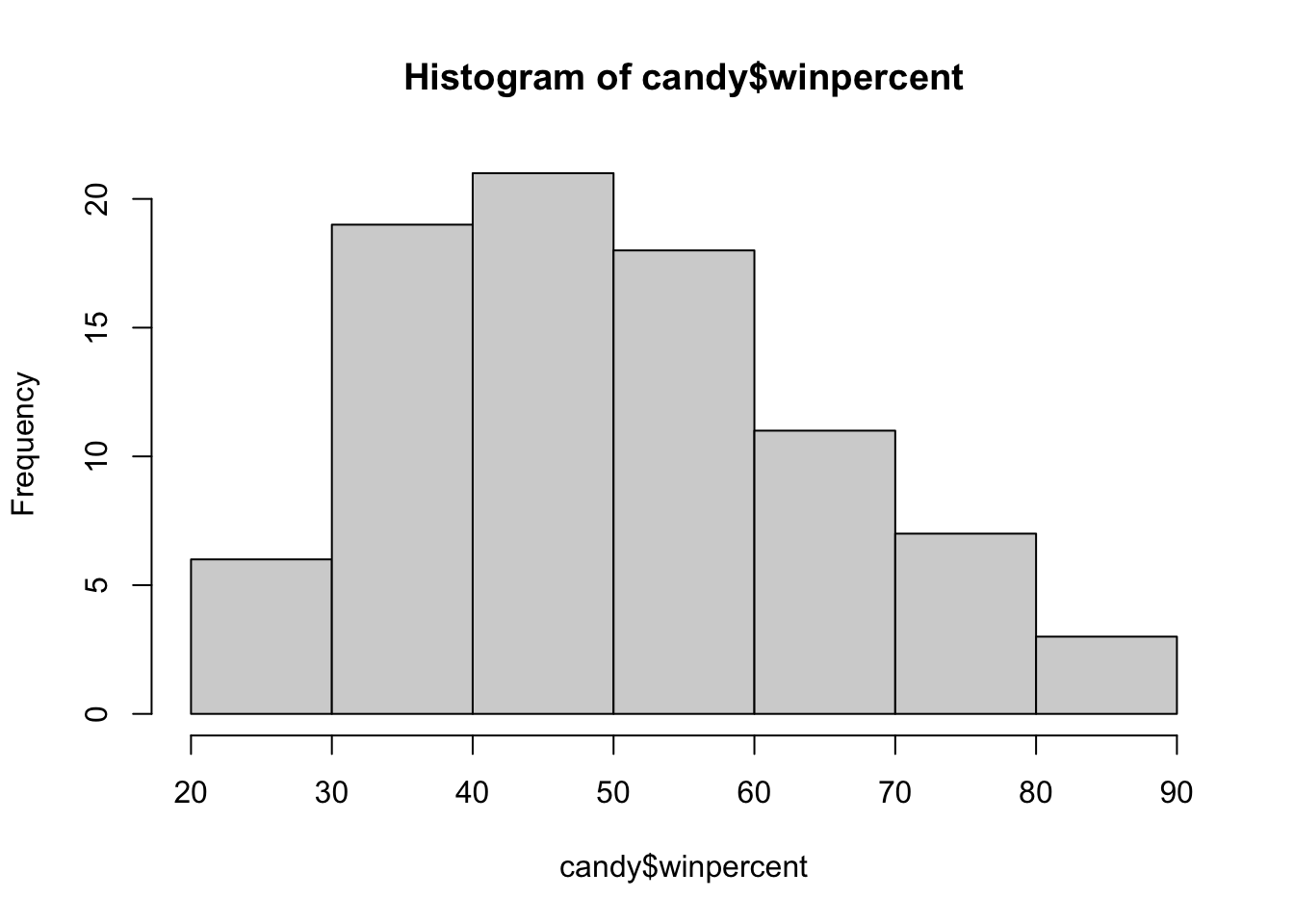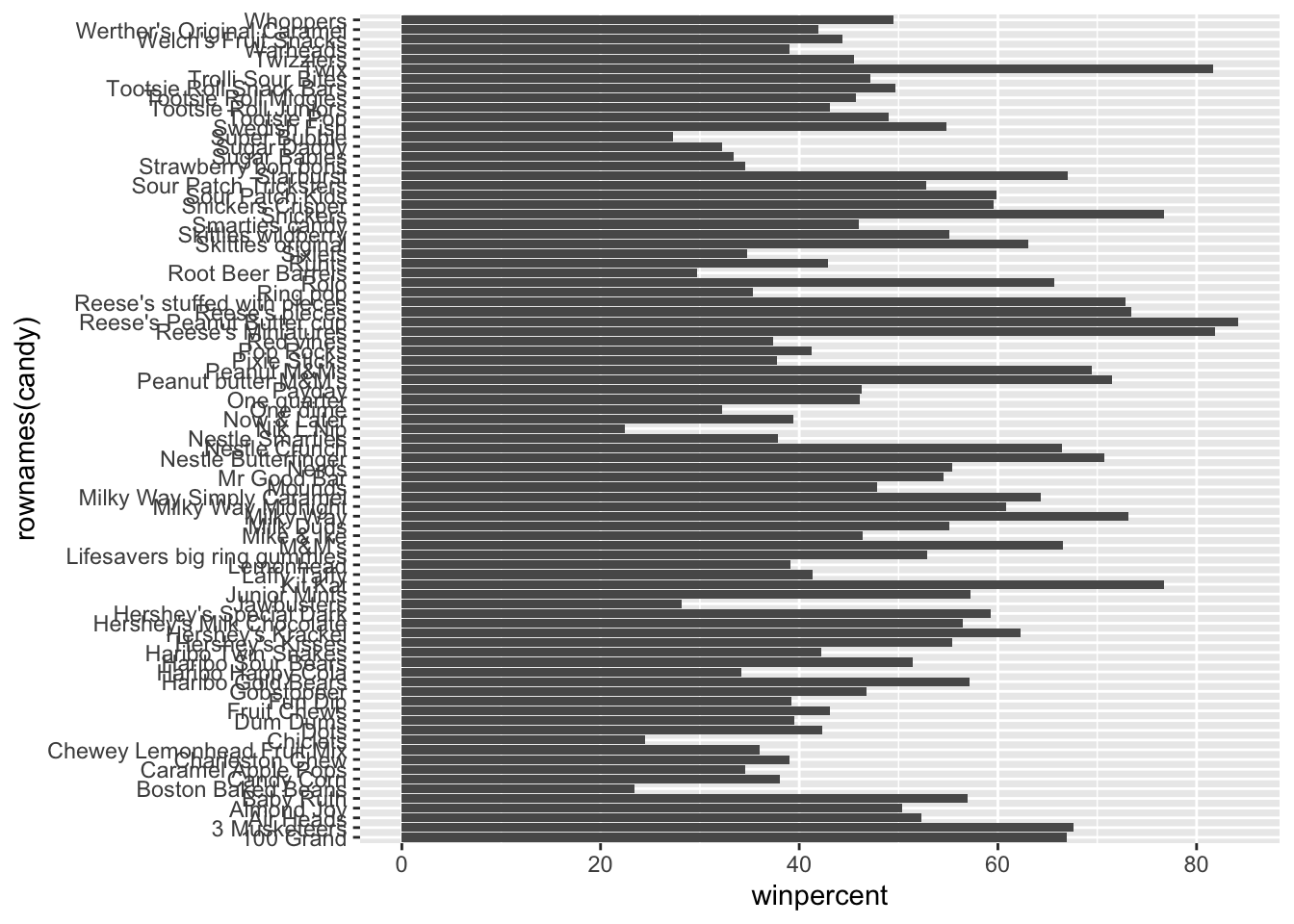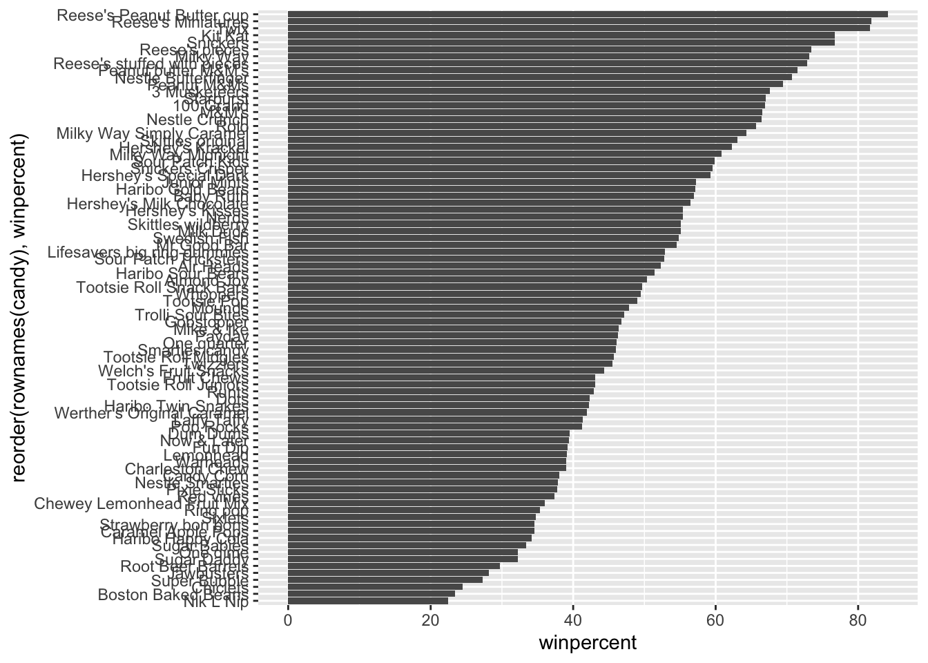 ord <-order(candy$pricepercent, decreasing =TRUE)head( candy[ord,c(11,12)], n=5 )