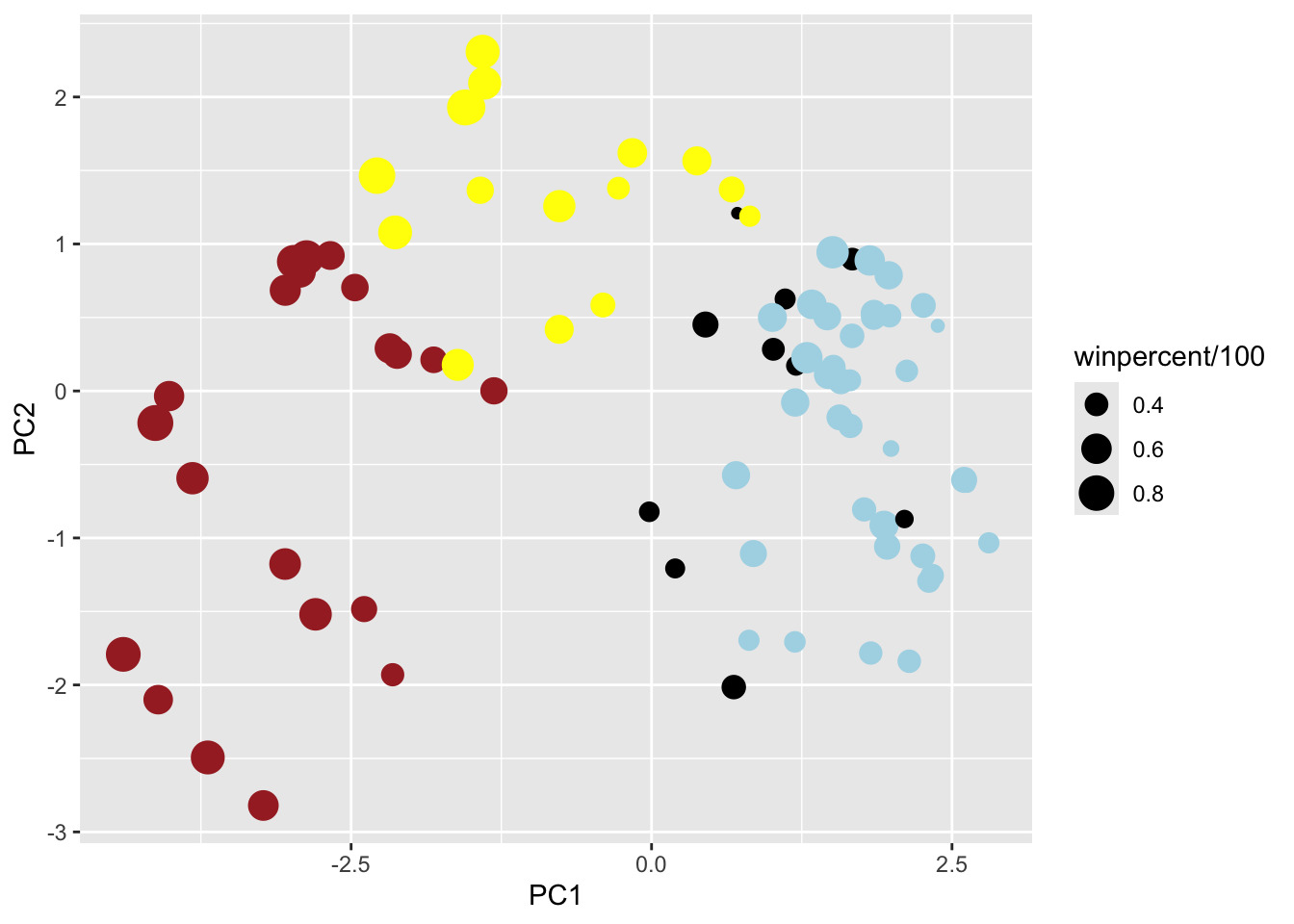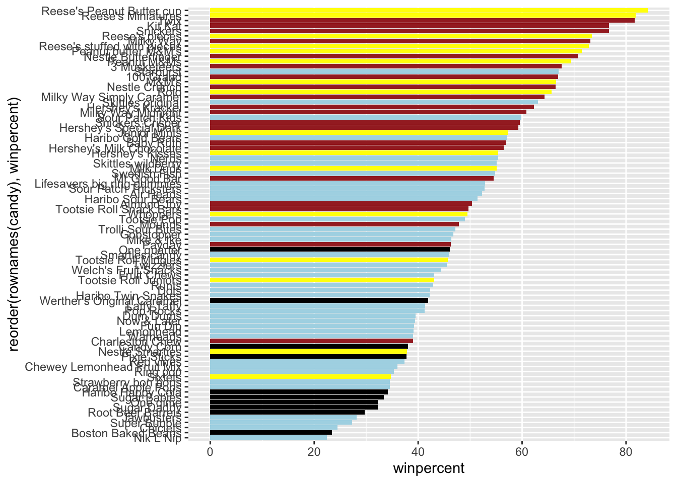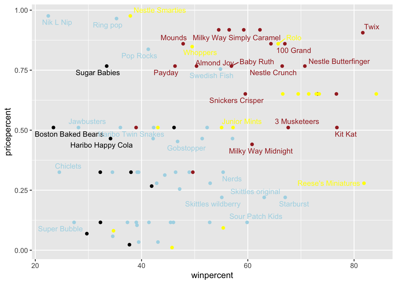 library(ggrepel)# How about a plot of win vs priceggplot(candy) +aes(winpercent, pricepercent, label=rownames(candy)) +geom_point(col=my_cols) +geom_text_repel(col=my_cols, size=3.3, max.overlaps =5)
