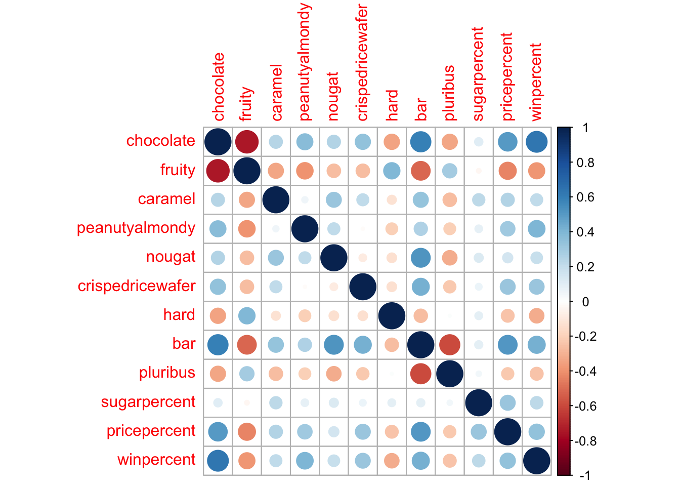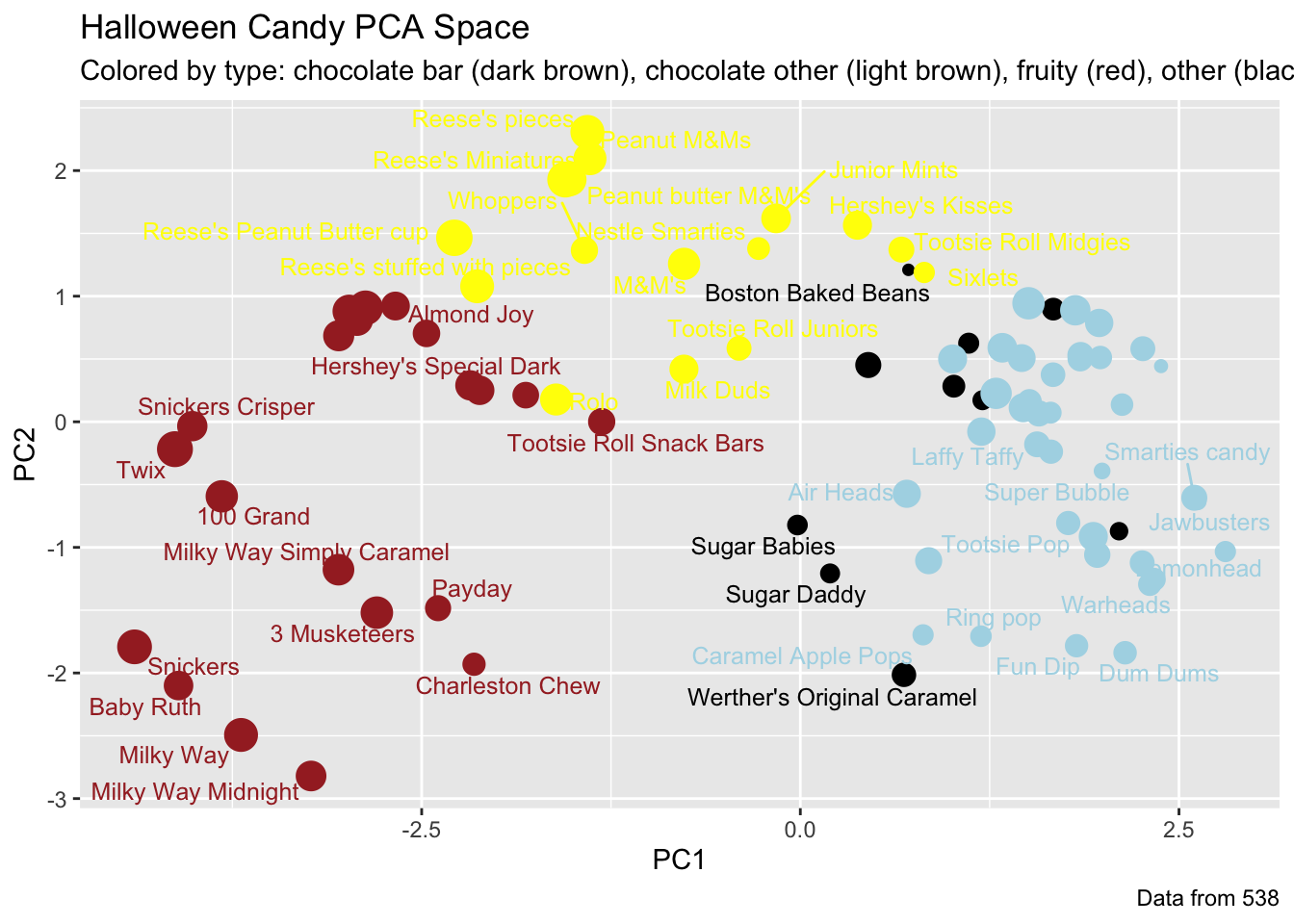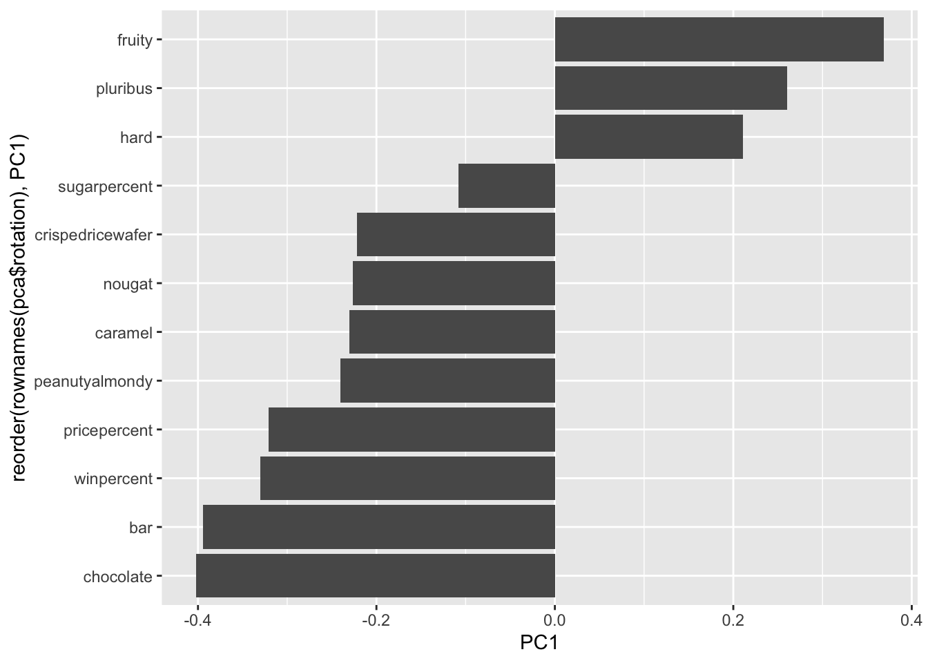 The variables that were picked up strongly by PC1 in the positive value are Fruity, hard, and pluribus. They make sense based on the correlation graph because when comparing them together, they are shown to have positive correlation. This means that PC1 represents candies that are fruity, hard, and pluribus.