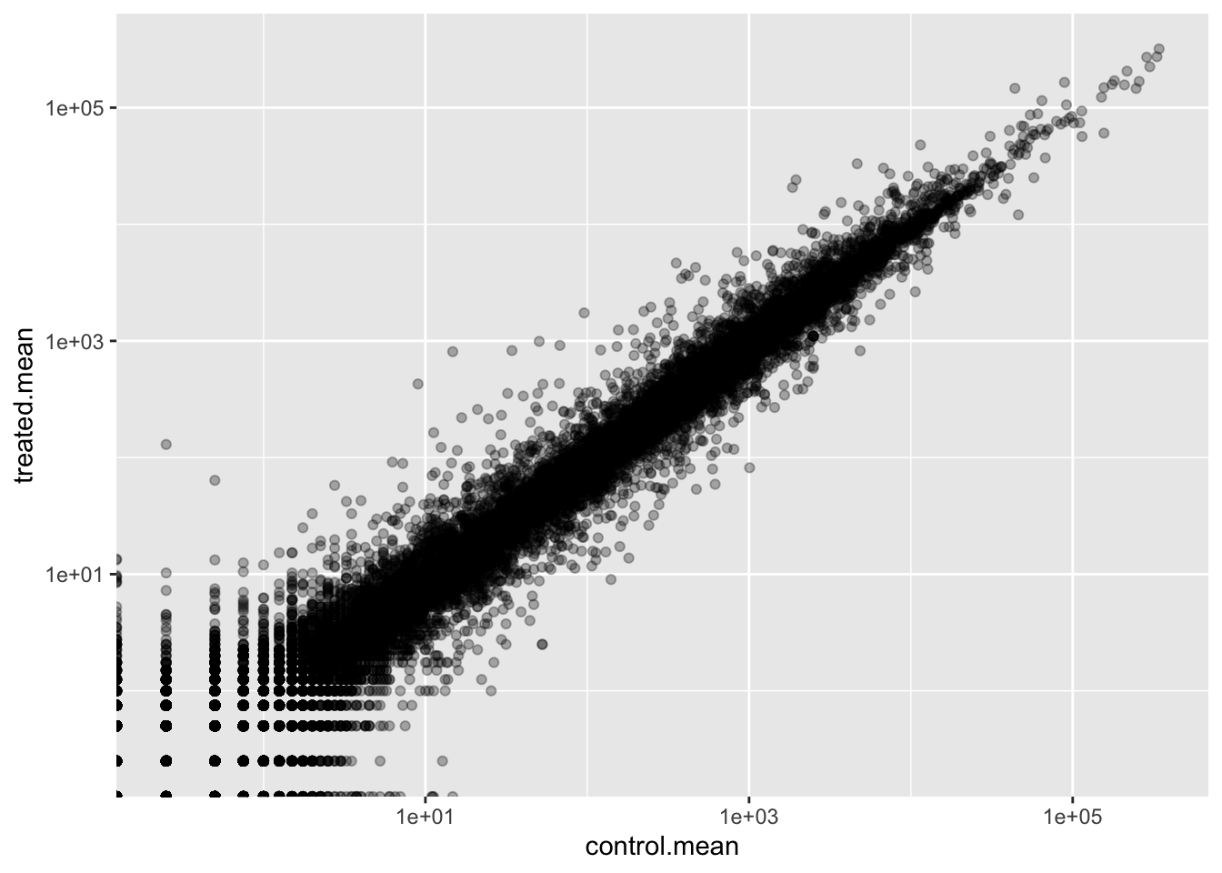 ggplot(meancounts, aes(control.mean, treated.mean)) + geom_point(alpha = 0.3) + scale_x_log10() + scale_y_log10()Warning in scale_x_log10(): log-10 transformation introduced infinite values.