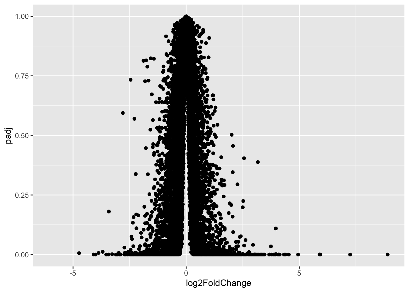 ggplot(res, aes(log2FoldChange, padj)) + geom_point()Warning: Removed 23549 rows containing missing values or values outside the scale range