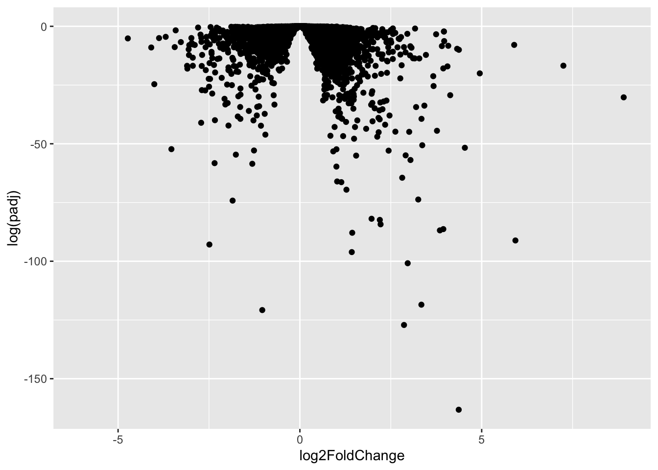 ggplot(res, aes(log2FoldChange, log(padj))) + geom_point()Warning: Removed 23549 rows containing missing values or values outside the scale range