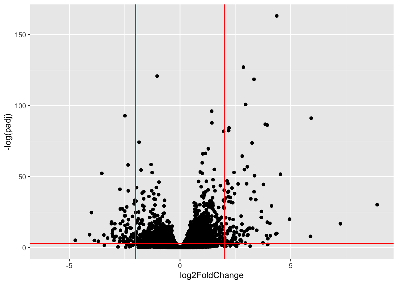 ggplot(res, aes(log2FoldChange, -log(padj))) + geom_point() + geom_vline(xintercept = c(-2,+2), col = "red") + geom_hline(yintercept = -log(0.05), col = "red")Warning: Removed 23549 rows containing missing values or values outside the scale range